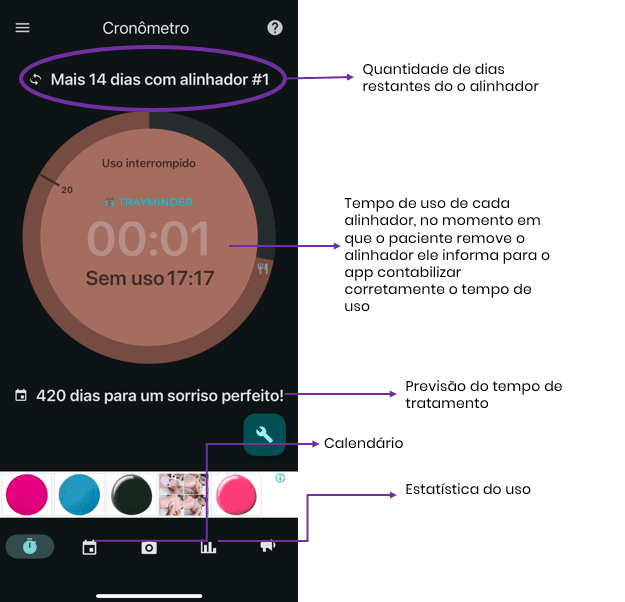 Dica: Incentivar o paciente a usar lembretes no celular para a troca do alinhador ou baixar o aplicativo TrayMinder **onde o paciente recebe notificações para realizar a troca dos alinhadores, e pode acompanhar o tempo de uso.