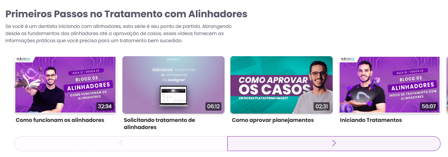 Acreditamos que a educação contínua é essencial para o sucesso. Por isso, disponibilizamos aulas e processos de recredenciamento para que nossos dentistas estejam sempre alinhados às melhores práticas e possam oferecer aos pacientes o que há de mais moderno em ortodontia com alinhadores.